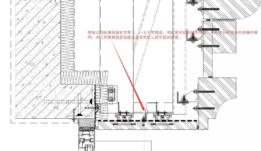 2、吊顶石材的处理在一些入口、檐口等位置,涉及到外立面石材与吊顶交接的收口面,往往为了考虑其美观而选用与外立面材料相一致的石材作为吊顶材料,这些部位同样不适合用普通的挂接方式来处理,某工程运用条件来连接吊顶板,最终导致大量吊顶石材的脱落。建议采用背栓系统,必要的话可在石材中部加打一个背栓,然后以钢丝绳连接到龙骨上,一旦石材脱落,钢丝绳可起到缓冲作用,另外在石材背部衬玻璃纤维网,并以环氧树脂胶粘接也能有效防止碎石板的坠落。