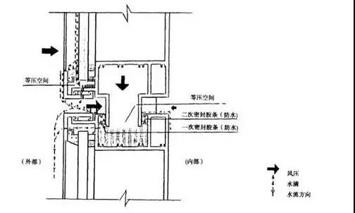 等压原理的核心思想是"雨幕"两侧的压力达到平衡,消除渗漏三要素中的"作用",尤其是风压的作用。实际应用中,真正达到等压并非易事,如自然界中风速是随机的,造成的波动风压很难使"雨幕"两侧时时等压。